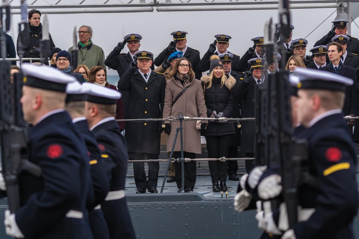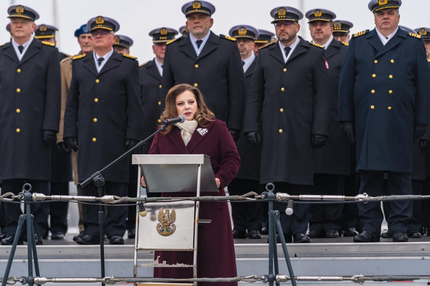The ceremony began with the national anthem and the raising of the Polish flag, accompanied by a full naval honor guard and the ceremonial grand ensign displayed aboard ORP Błyskawica.