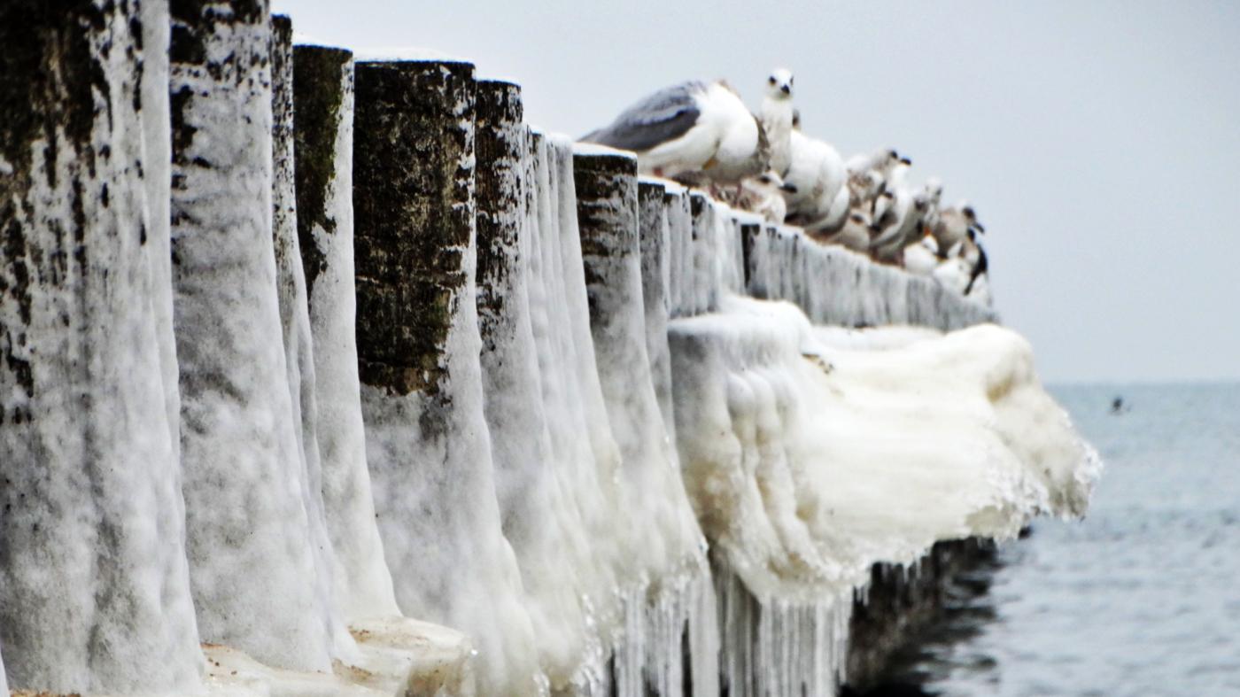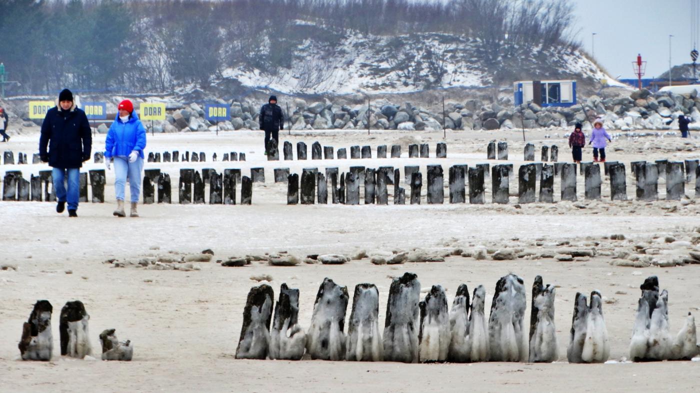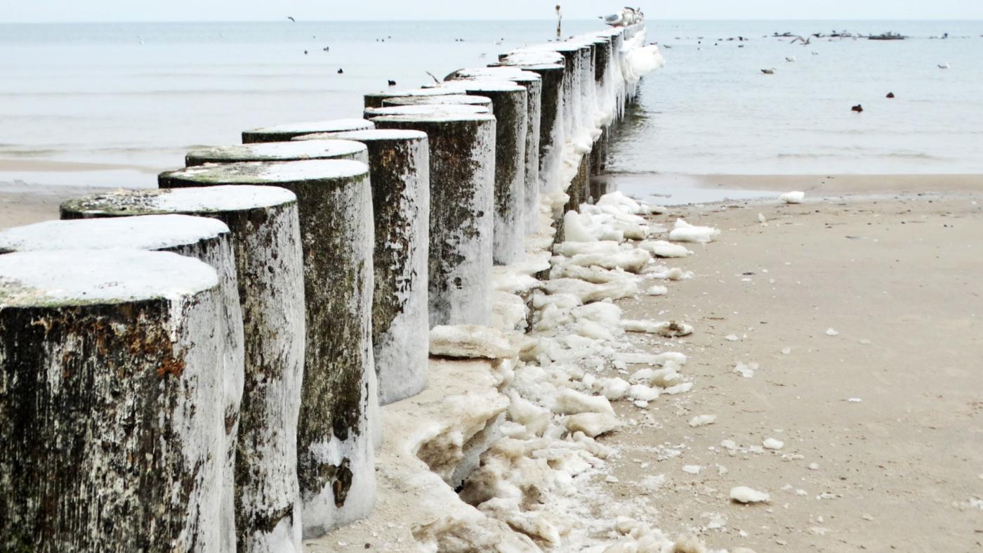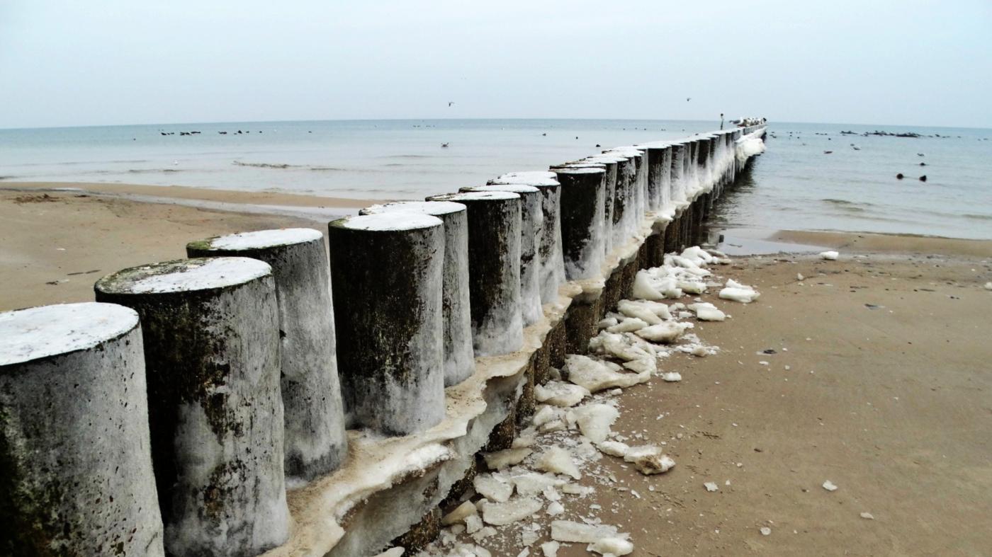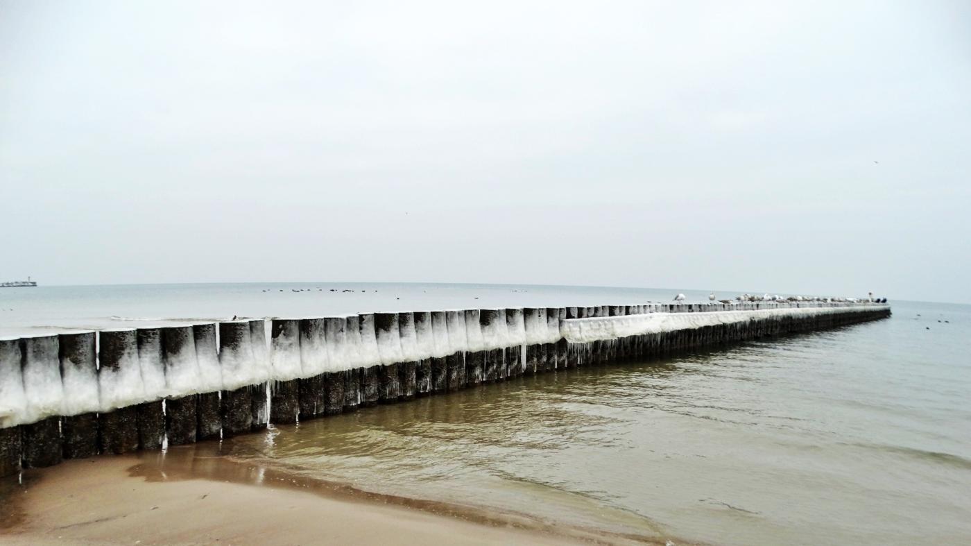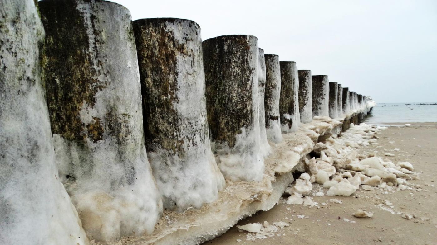 Ustka beach and groynes in a beautiful winter and icy scenery