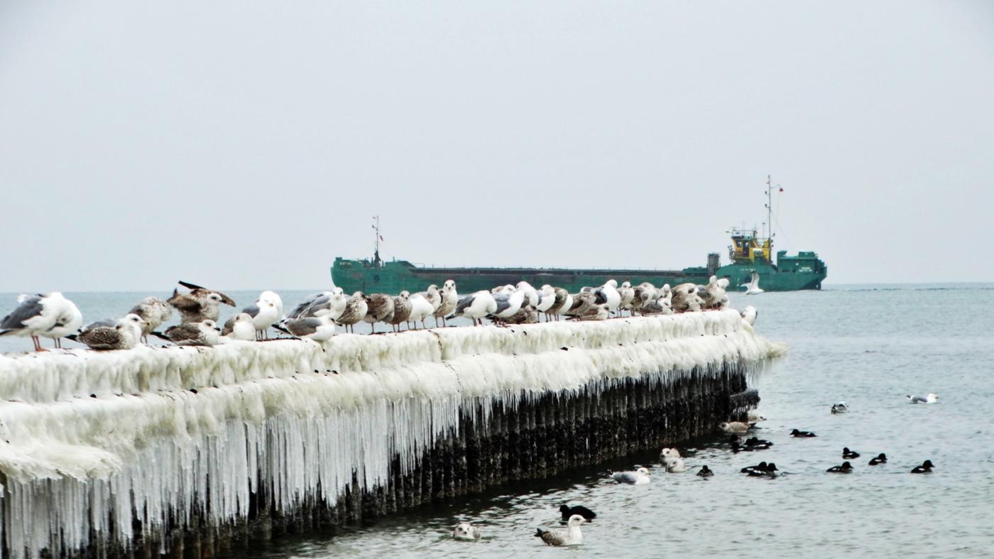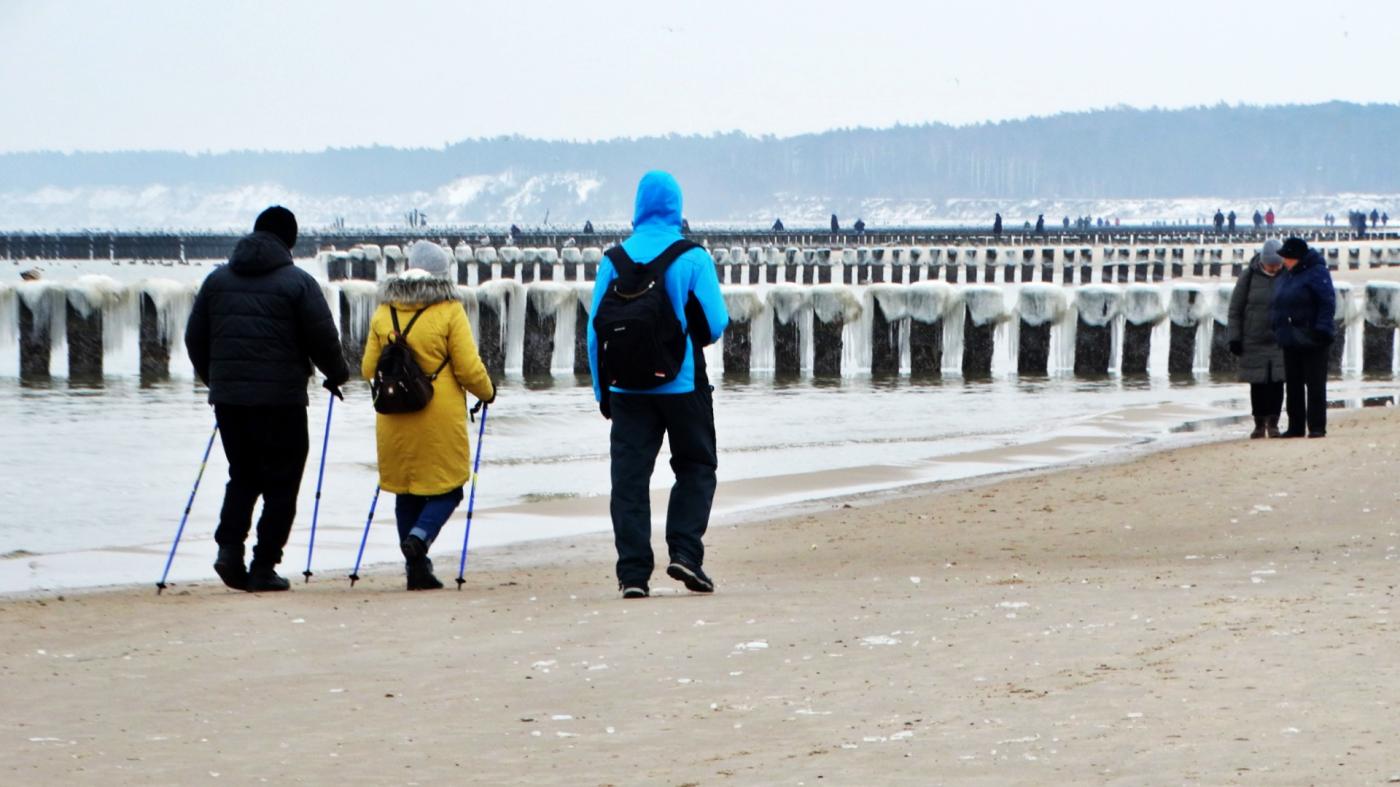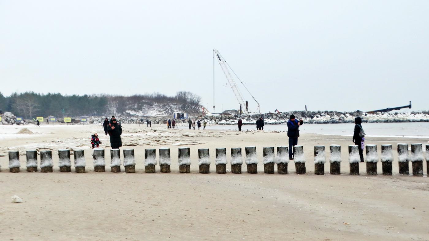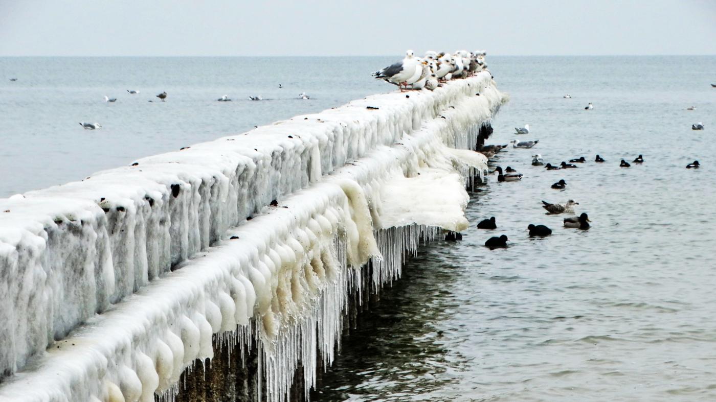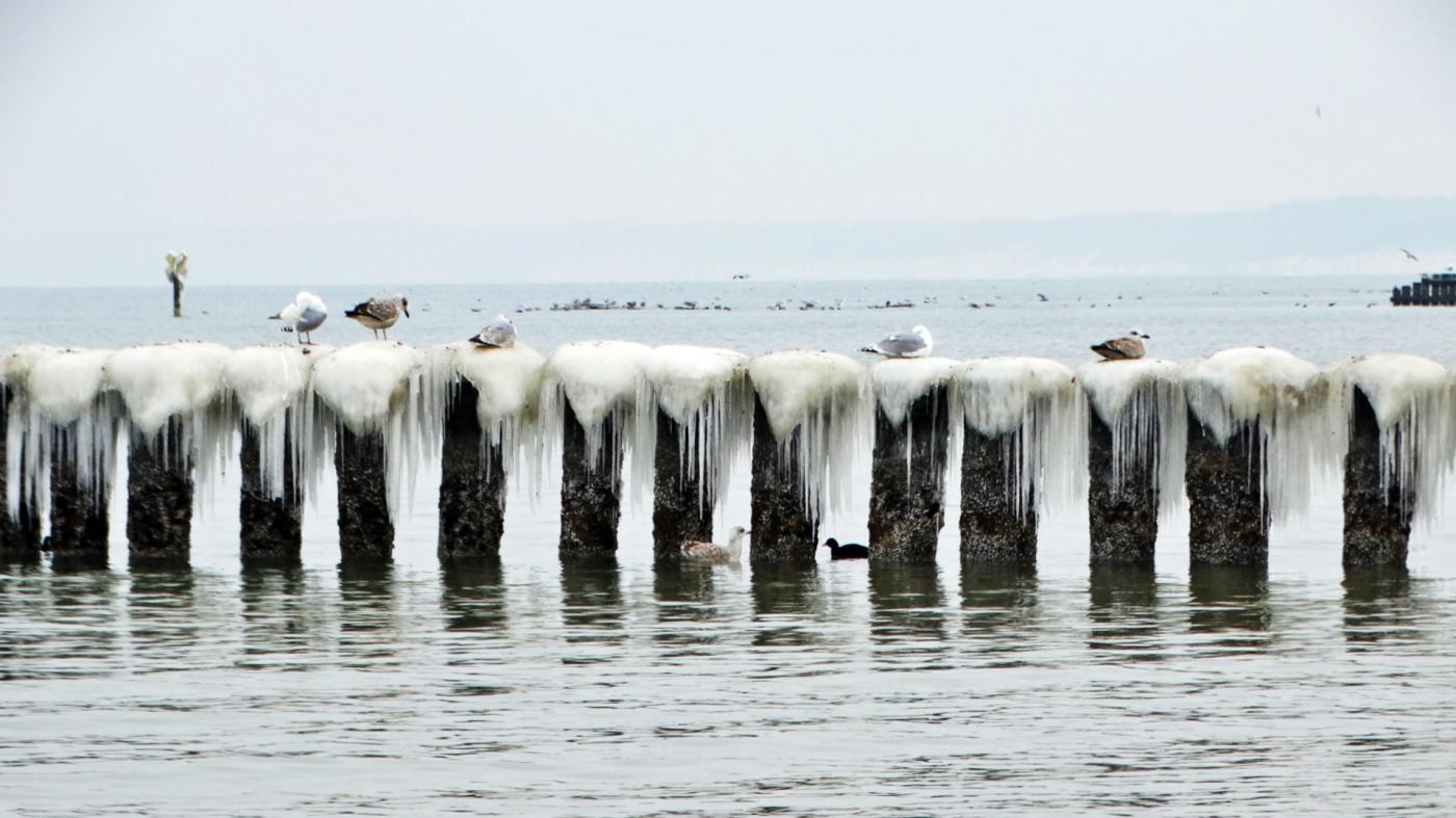 Ustka beach and groynes in a beautiful winter and icy scenery