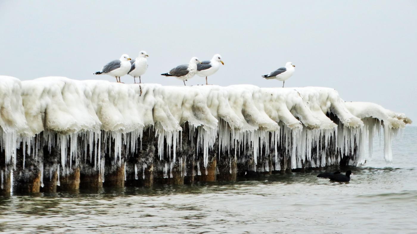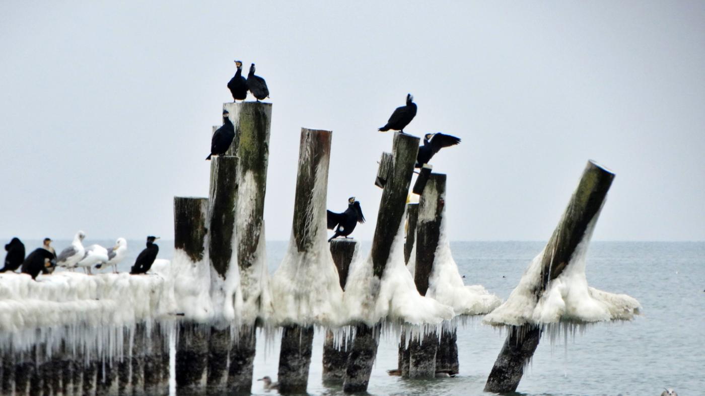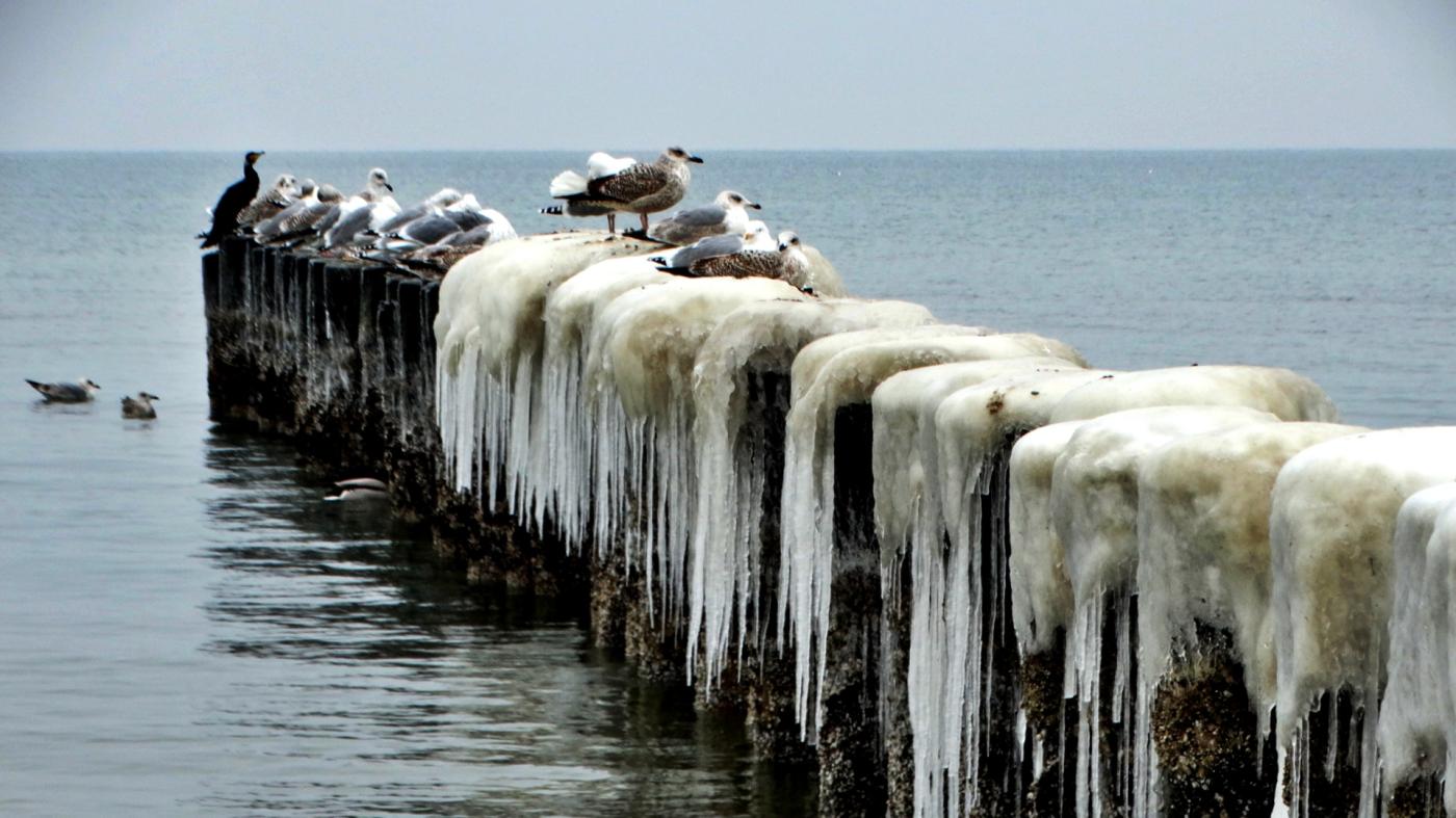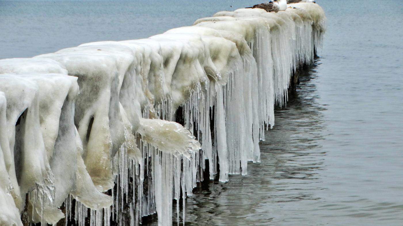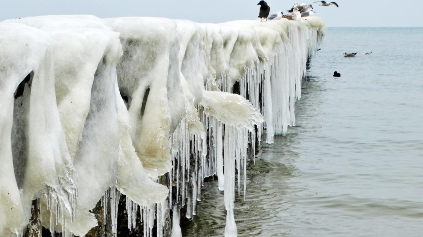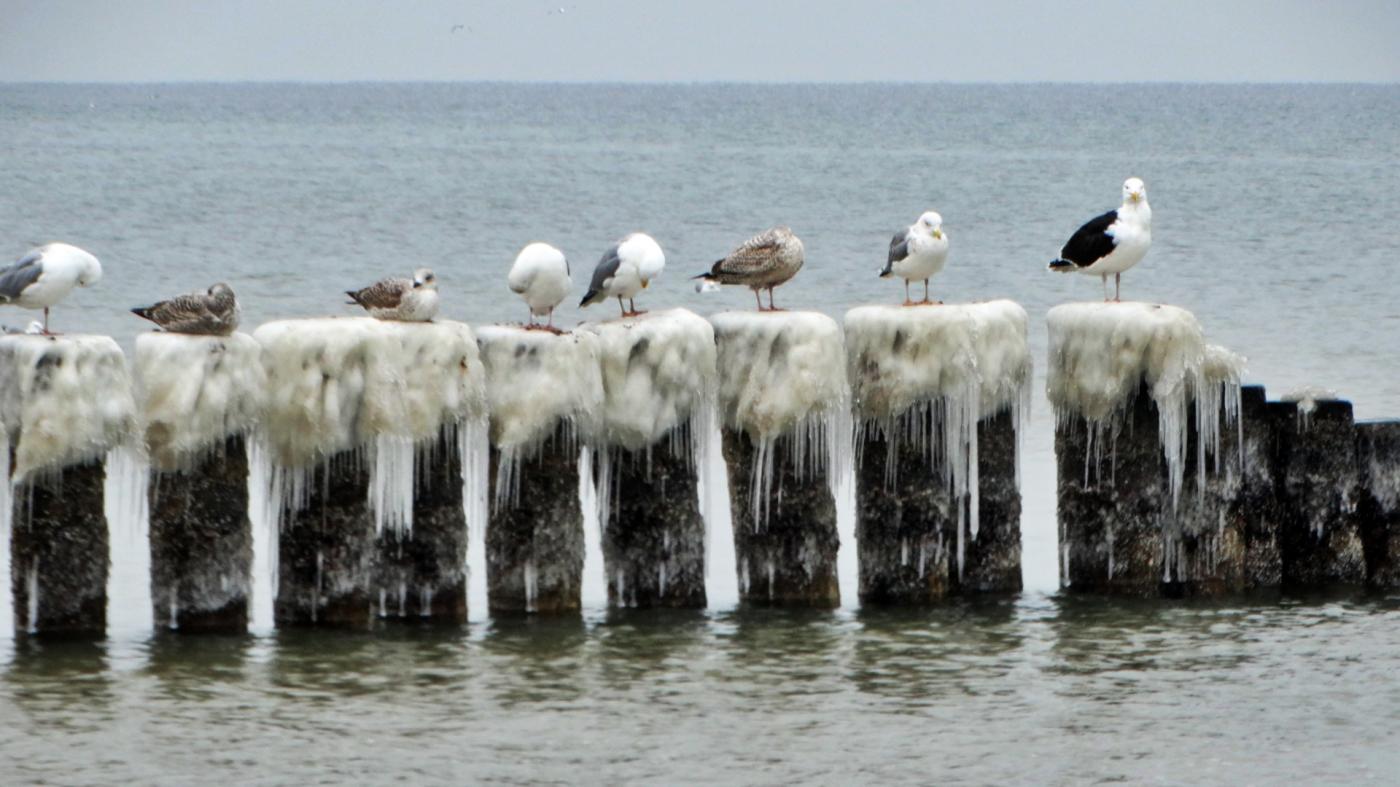 Ustka beach and groynes in a beautiful winter and icy scenery