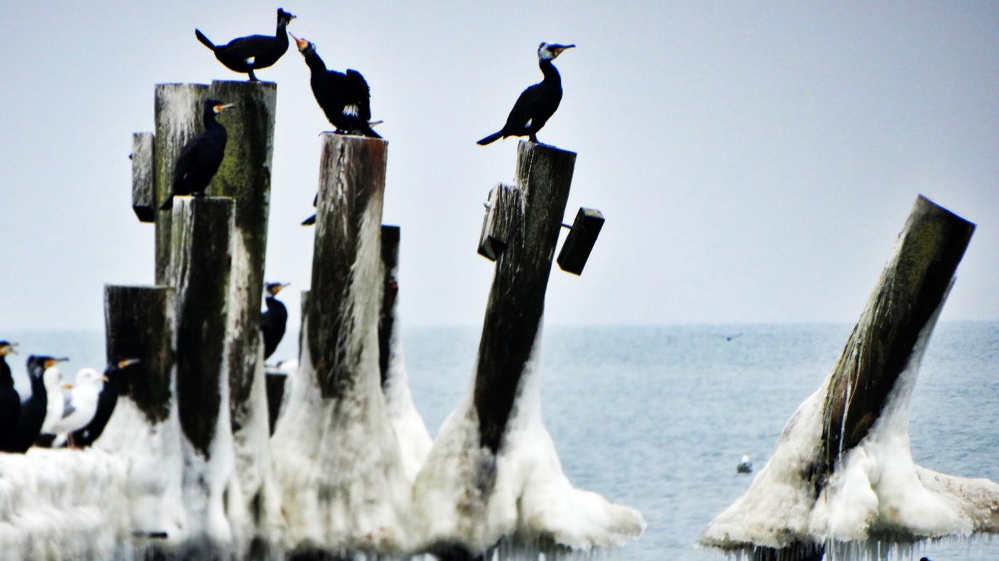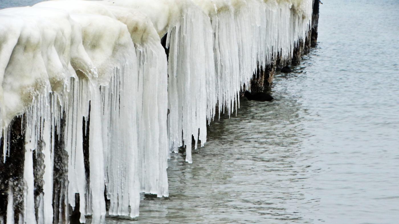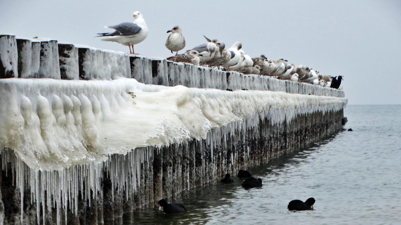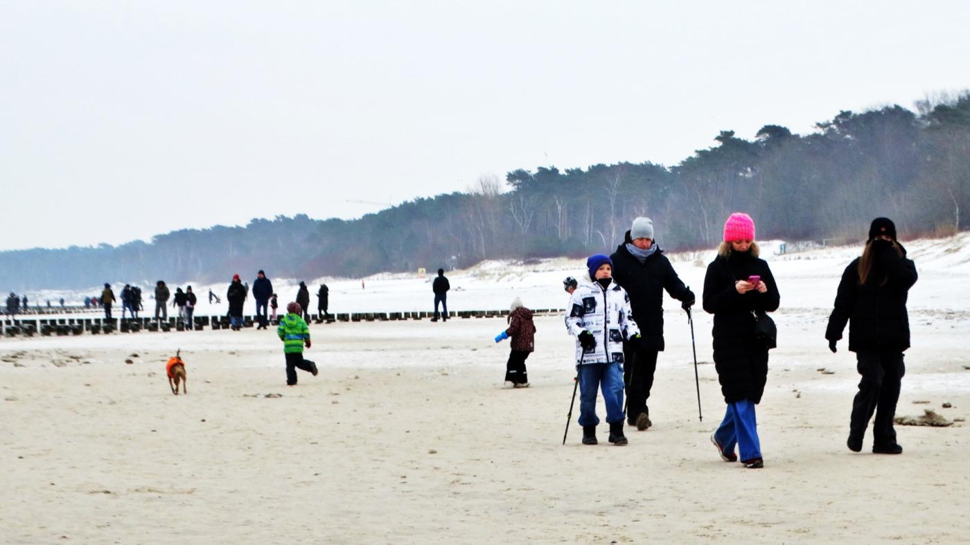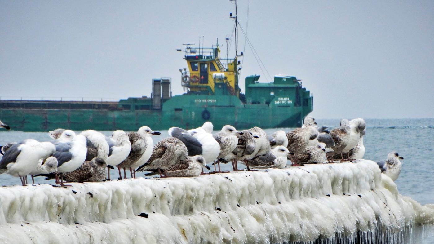 Ustka beach and groynes in a beautiful winter and icy scenery