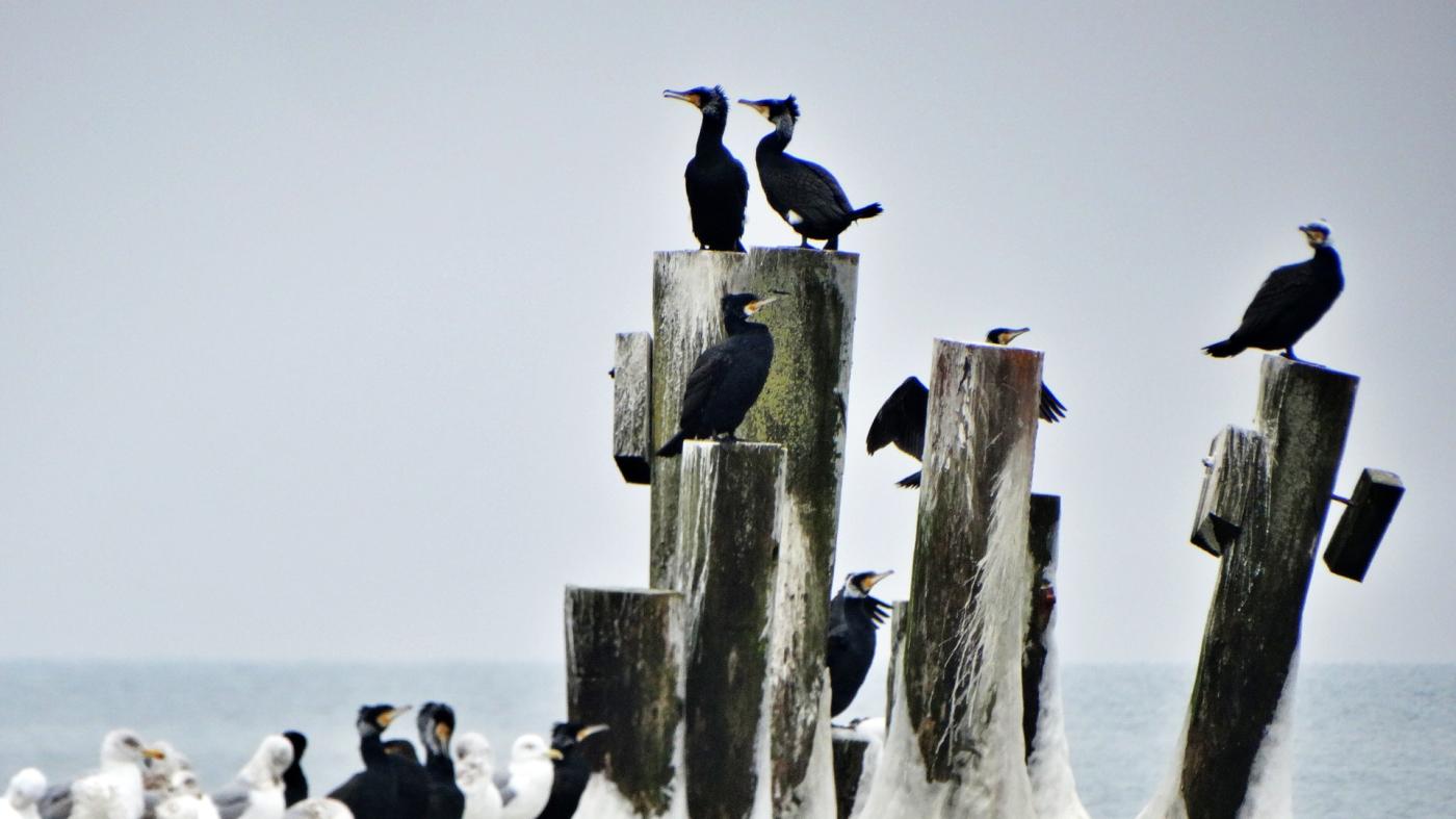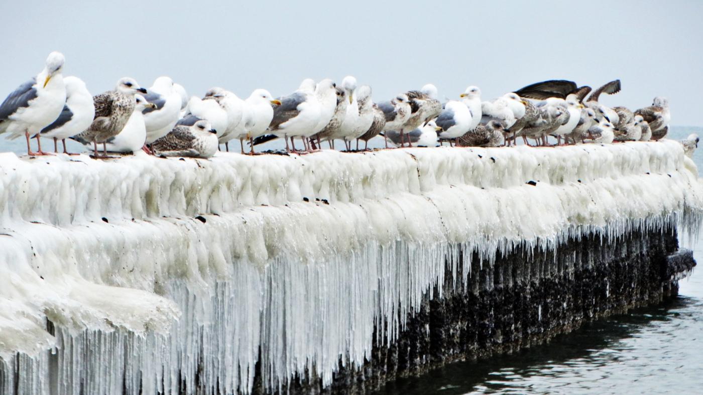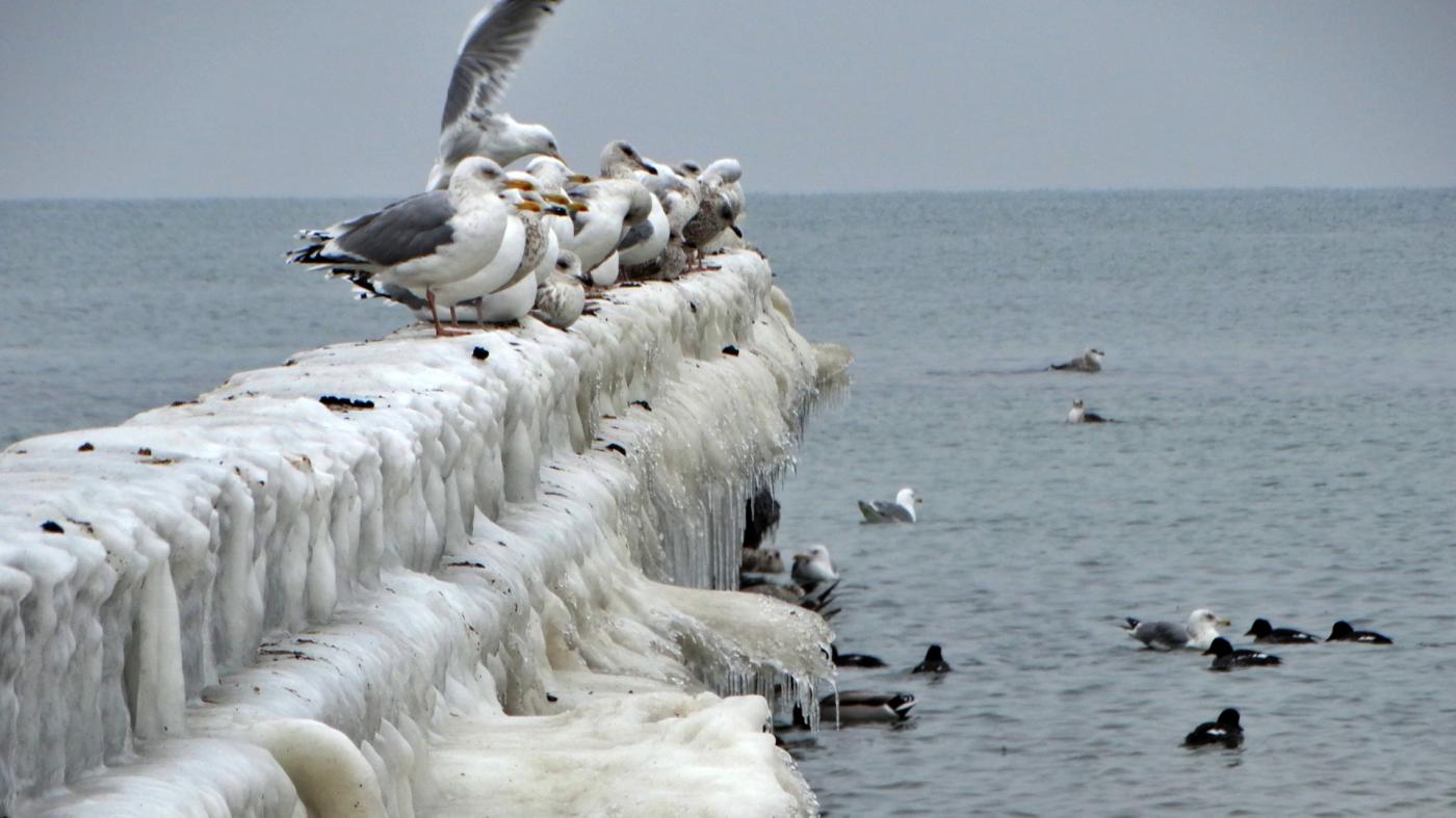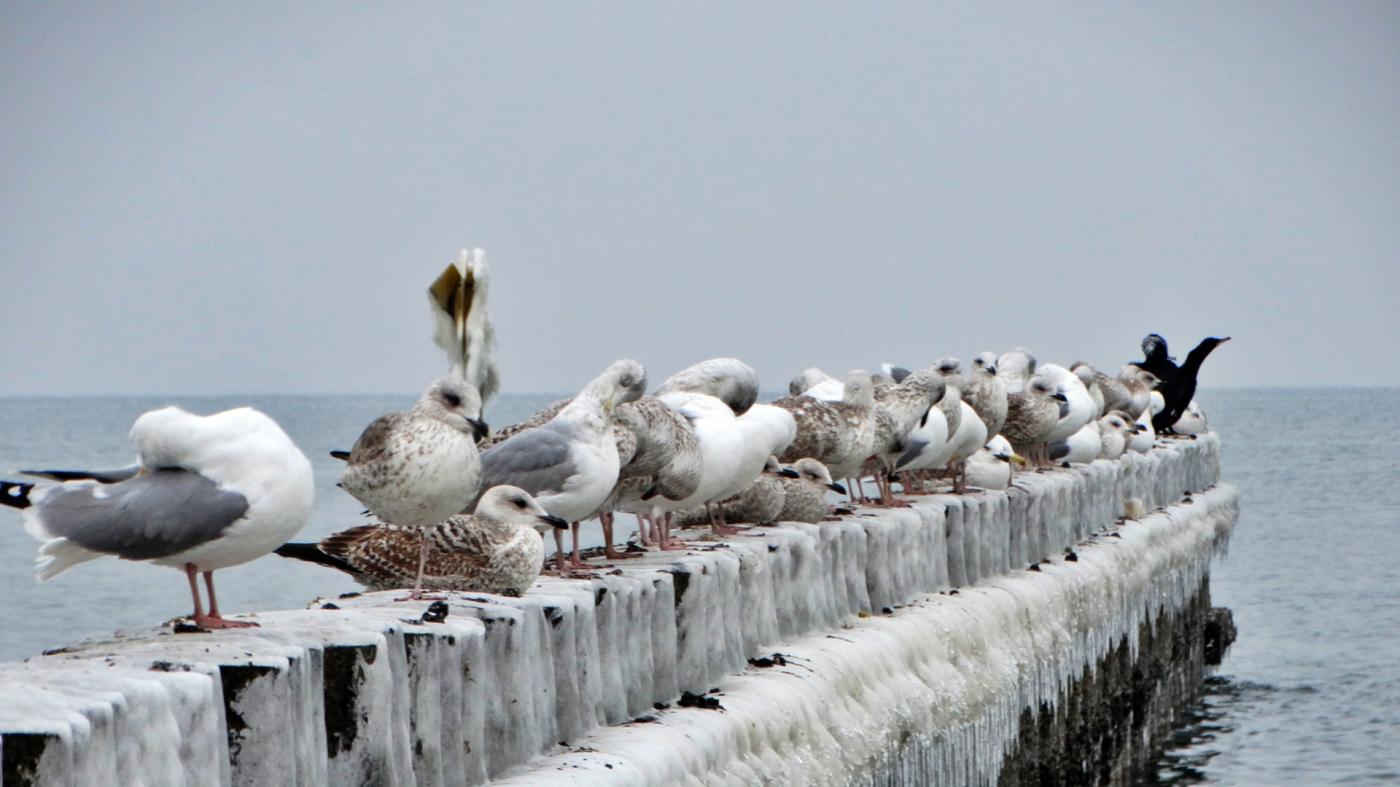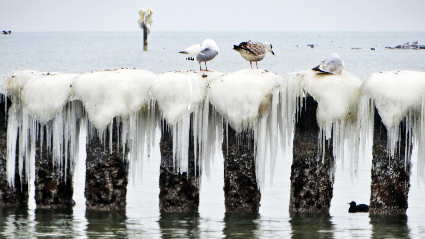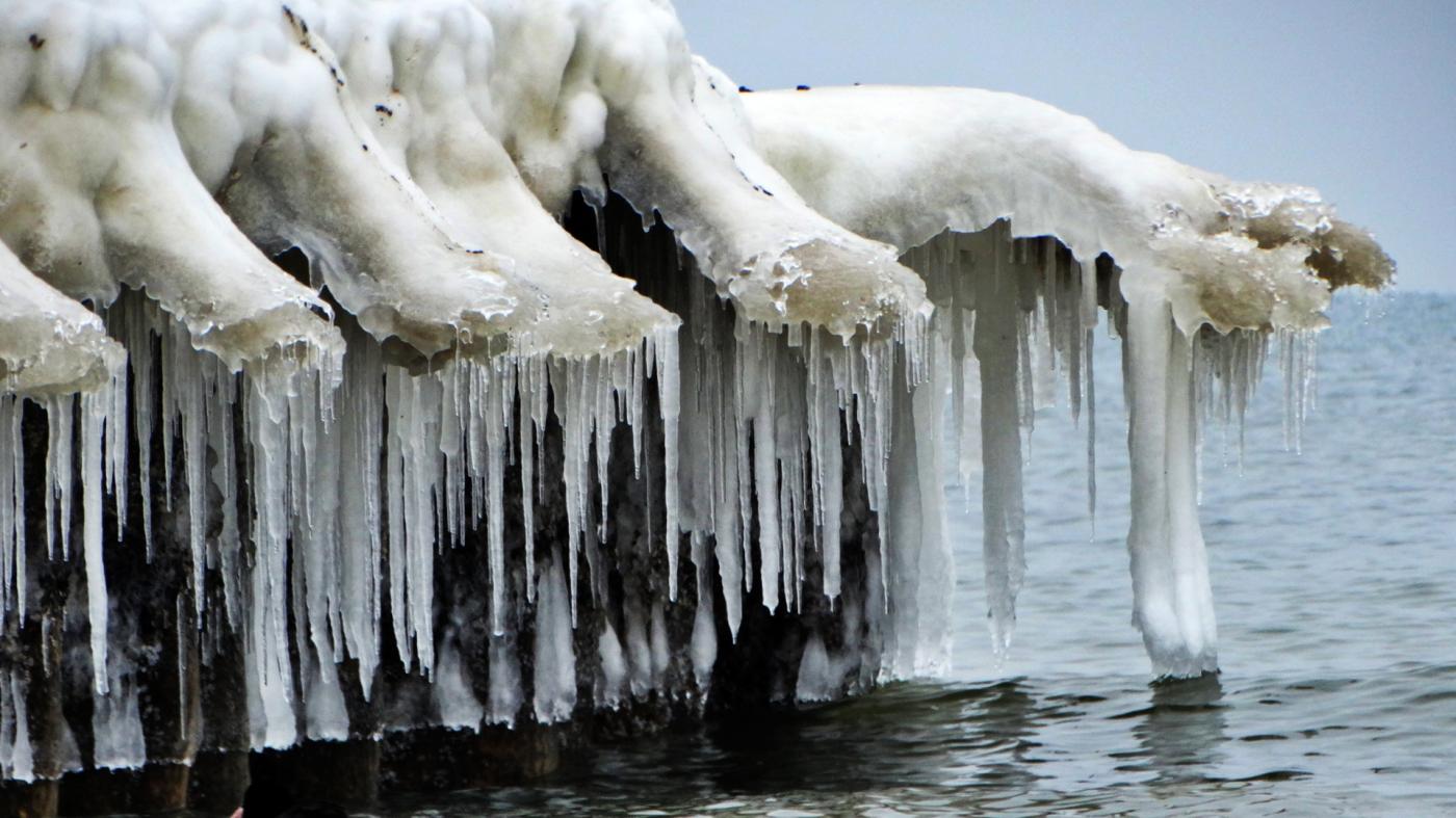 Ustka beach and groynes in a beautiful winter and icy scenery